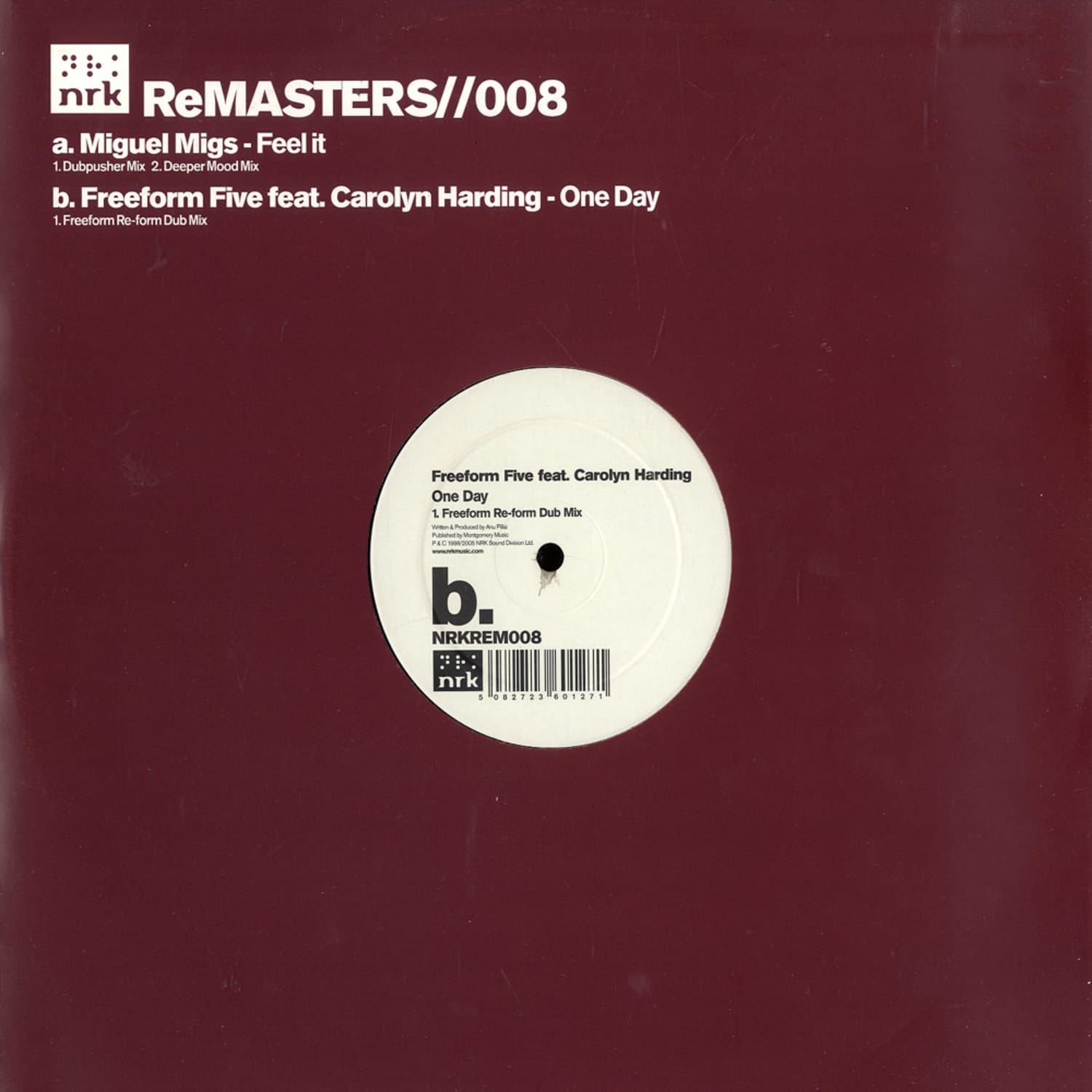 Miguel Migs has always been the master of dubby and hypnotic house grooves, and on >Feel It< the man really excelled himself. The >Dubpusher Mix< is a heavyweight house groove whilst the >Deeper Mood Mix< adds some great keys and melodies. On the flip of NRKREM008 is a very early NRK production. Anu Pillai AKA Freeform Five produced an early vocal house tune with legendary diva Carolyn Harding and here we ve remastered the chunky and robotic Dub Mix