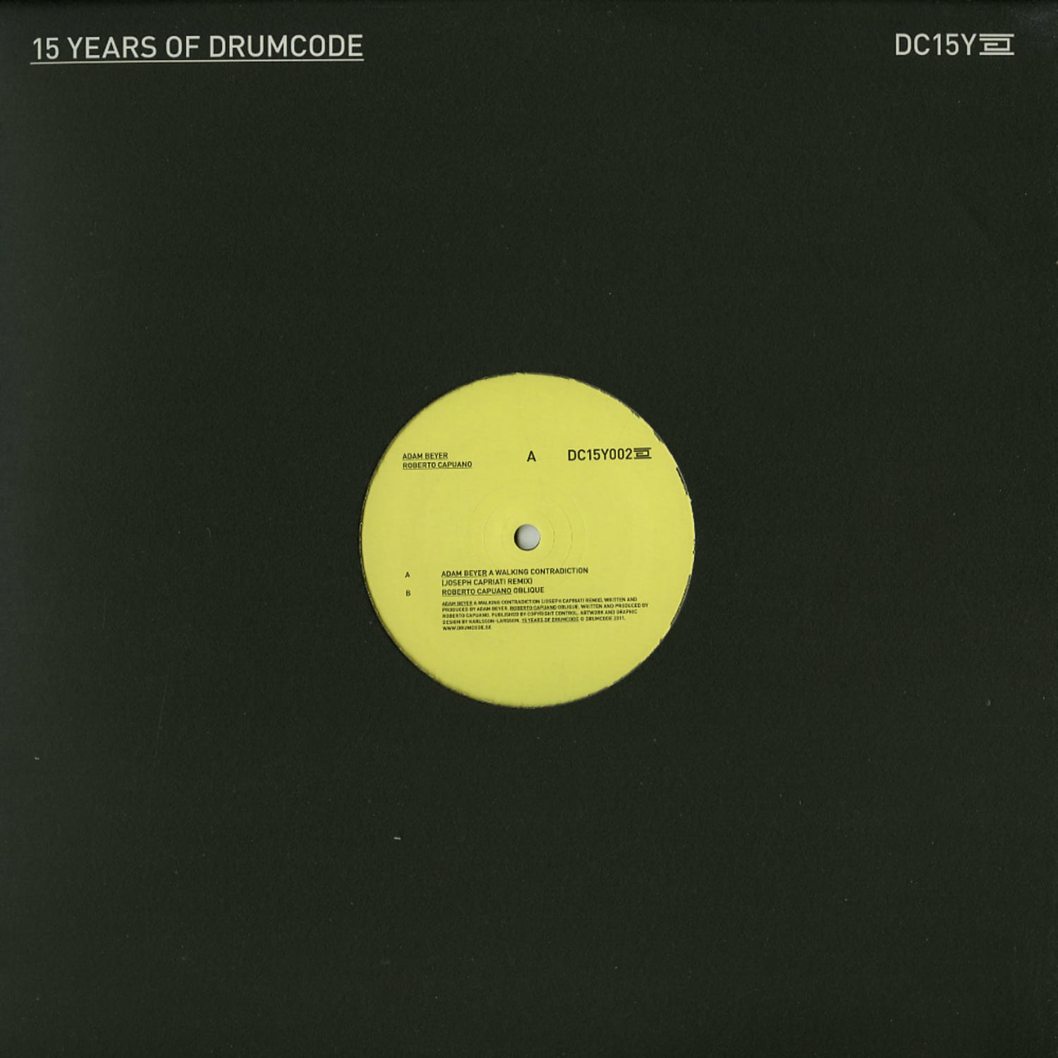 15 Years Of Drumcode , Part Two with Bangin Techno , A Side is made by Adam Beyer and Remixed by Joseph Capriati. Flip with > Olique <, made by Roberto Capuano