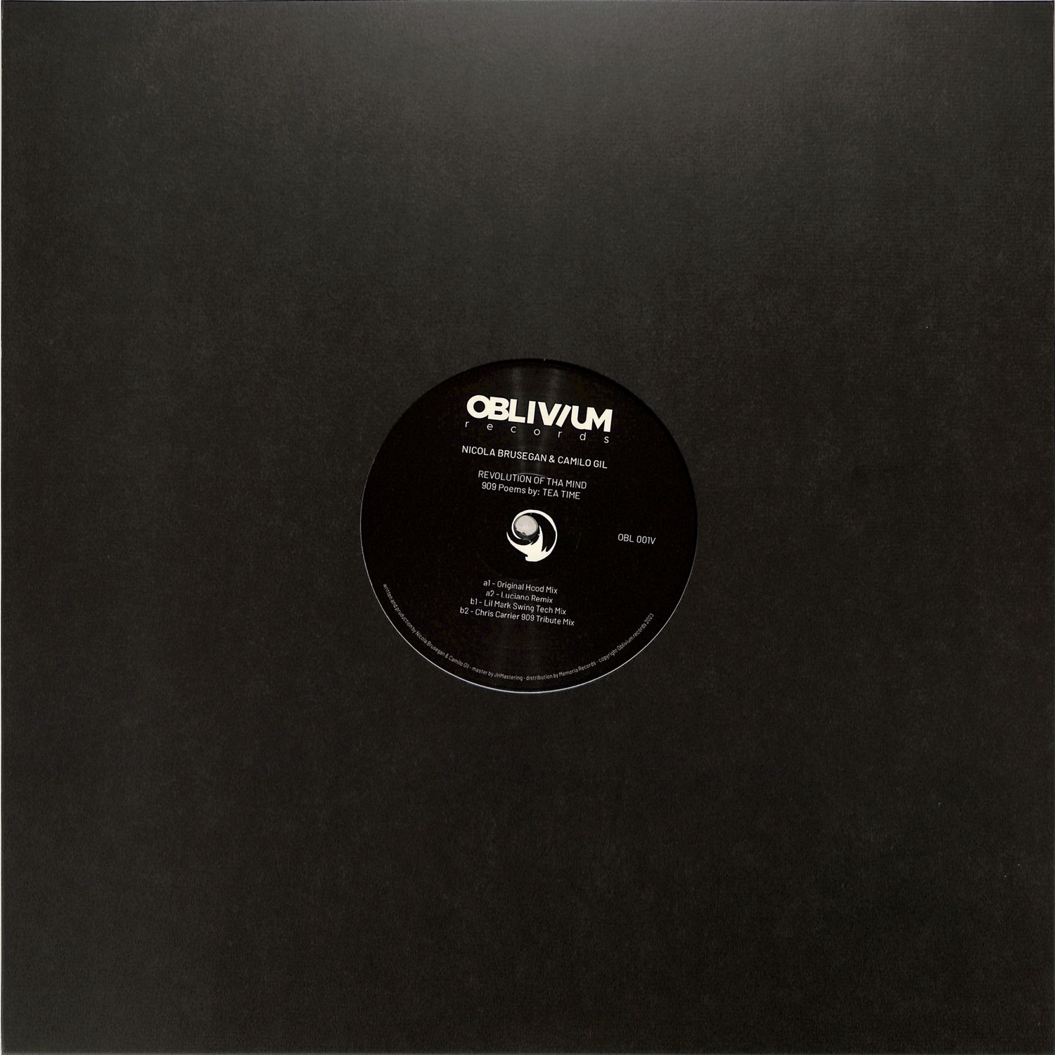 In the first edition of OBLIVIUM RECORDS, the friends Nicola Brusegan & Camilo Gil, part of the worldwide agency SUENA, use the best of their creativity, together with the Mc and Poet from Chile Tea Time (Perlon - Cadenza), to create a piece and three remixes of electronic music legends these 30 years as Chris Carrier, from the center of Paris in France and his remix with features Acid and Groove Lil Mark, a legend from the UK, and a sampler of swing, groove, and the sound that characterizes him as always and the Great Luciano, with his look at his times, of hyponitism and minimal techno, in a dimensional mix.[info sheet from distr.]
