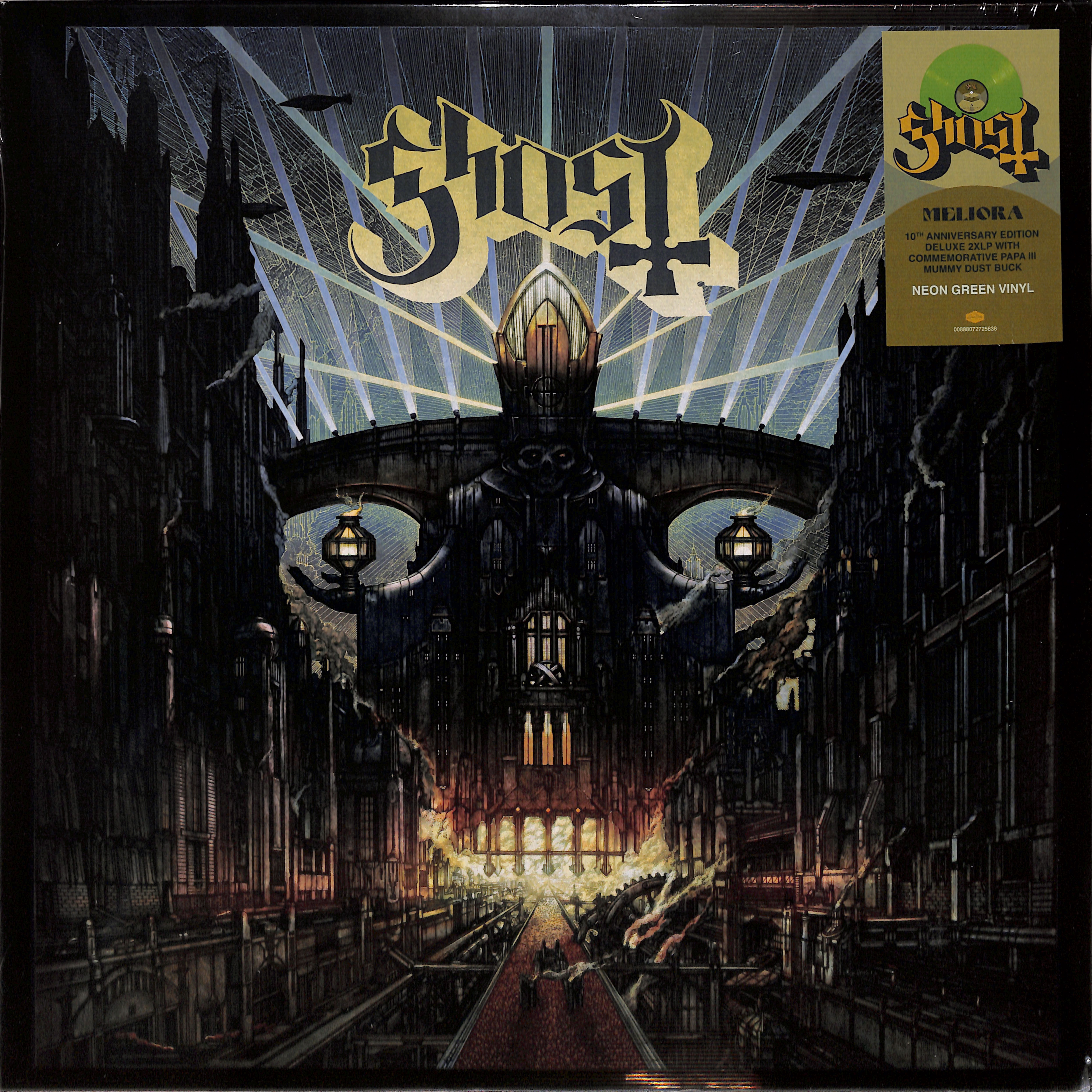 Zum 10-jährigen Jubiläum von Meliora erscheint eine exklusive Deluxe-Edition auf Vinyl. Das Album umfasst 15 Songs auf 2xLP Standard-Vinyl und kommt in einem hochwertigen Doppelcover mit breitem Rücken und glänzendem Finish. Jede Edition enthält ein spezielles Vinyl in Sonderfarbe sowie eine Papa III Mummy Dust Gedenkprägung mit metallic-grünem Pantone-Detail. Abgerundet wird das Package durch einen 10th Anniversary Sticker auf der Folienverschweißung, der die besondere Natur dieser Pressung hervorhebt.[info sheet from distr.]