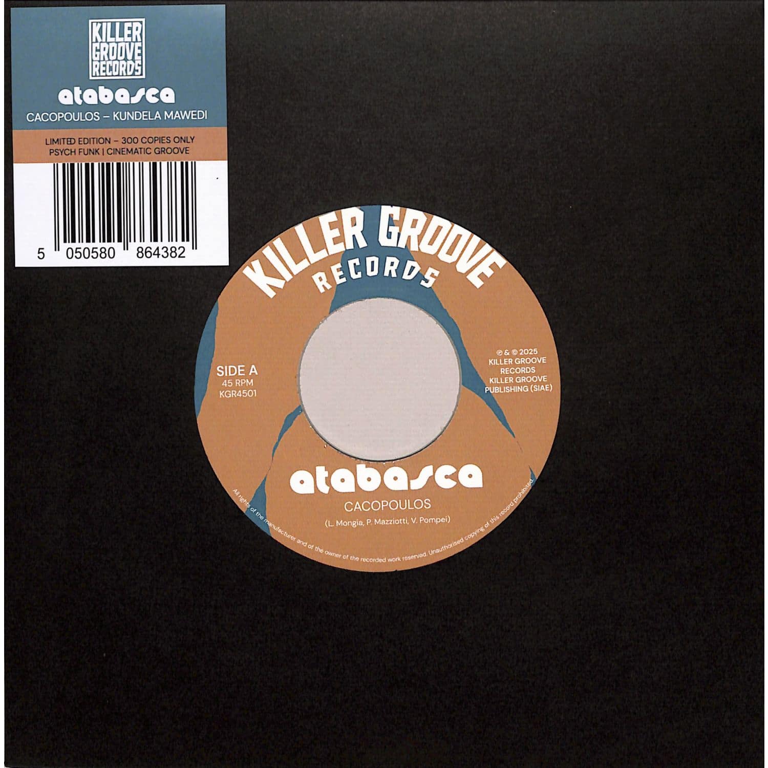 Killer Groove Records proudly presents the debut 45 by Italian cinematic funk trio Atabasca. A syncopated journey where funk, psychedelia, and cinematic groove merge into a timeless narrative suspended between rhythm and vision. A killer double-sider, blending psychedelic and funk moods with percussive, jazzy textures. A must-have gem for every groove-loving DJ.[info sheet from distr.]