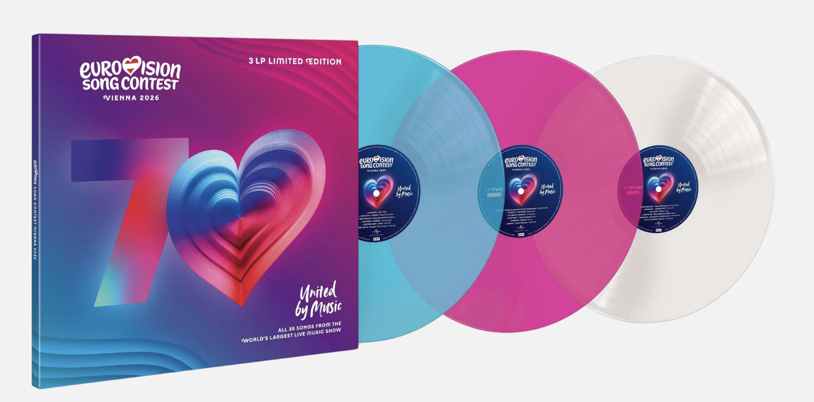 Der Eurovision Song Contest feiert in diesem Jahr sein 70-jähriges Bestehen. Ausgetragen wird der Wettbewerb diesmal in Wien. Deutschland schickt Sängerin Sarah Engels mit dem Titel "Fire" ins Rennen. Ansonsten nehmen noch weitere 36 Länder teil. Alle Titel sind auf der 2CD und der limitierten und farbigen 3Vinyl zu finden. Die DVD erscheint dann nachgelagert im Juli. Wie immer lautet das Motto: United by Music[info sheet from distr.]
