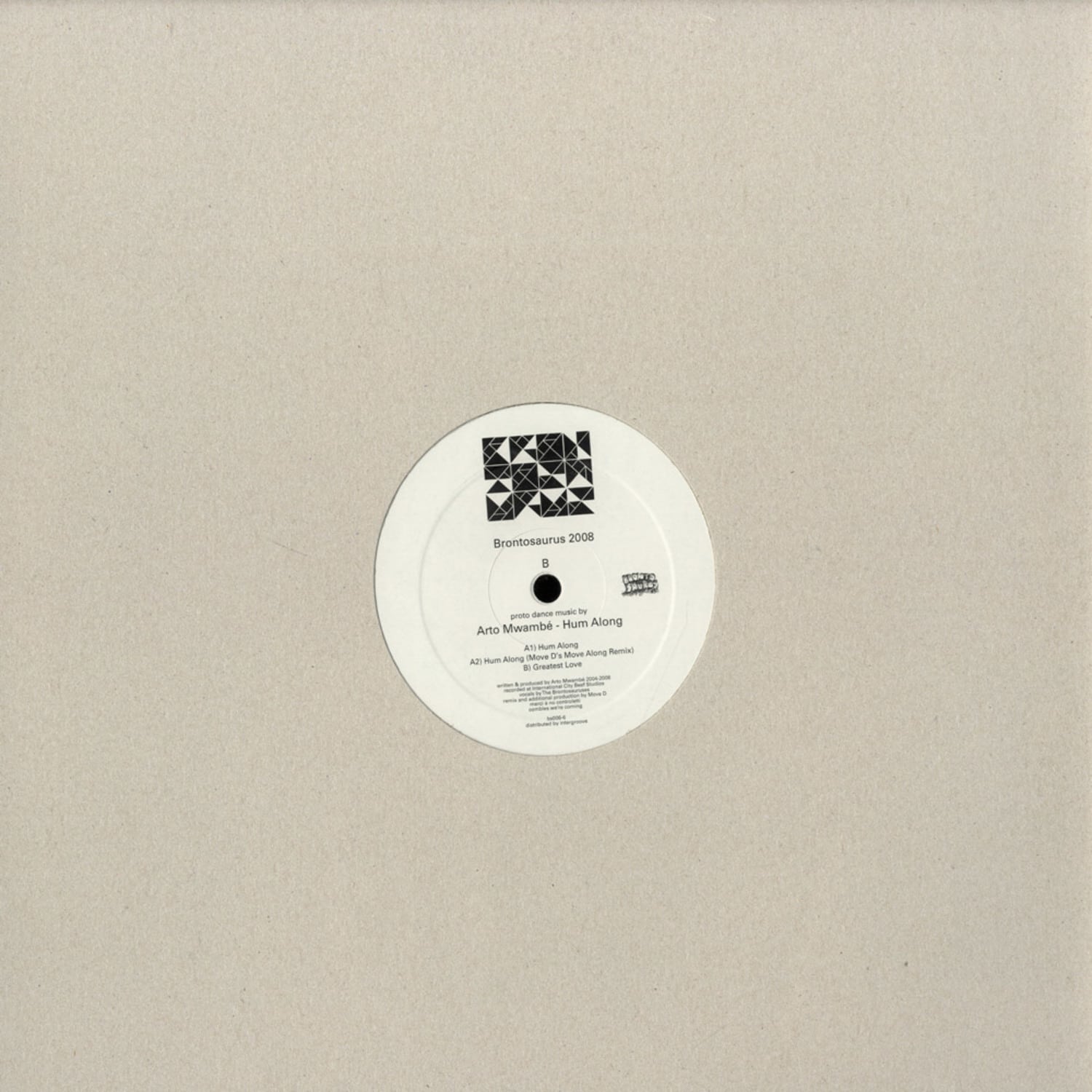 Hum Along is one of the earliest productions of Mr. Mwambe. He started the track in the beginning of 2004 and for the last 4 years it has always been a very important and personal part of his life. Only Brontosaurus intelligence & ca$h were able to get this masterwork for this lickyboom- boom-down house 12. To complete the commotion full time nice guy, father and electronic innovator Move D from the beautiful city of Heidelberg sat down to deliver a spontaneous disco version of the track – reanimating the fresh and impro vibe of late 90ies german disco / house productions. The B-side >Greatest Love< continues where Artos Mudhutma 12 ends, celebrating the unholy passion of deep housemusic. Voila.. a limited number of covers will be hand-printed with another nice torso. As always.