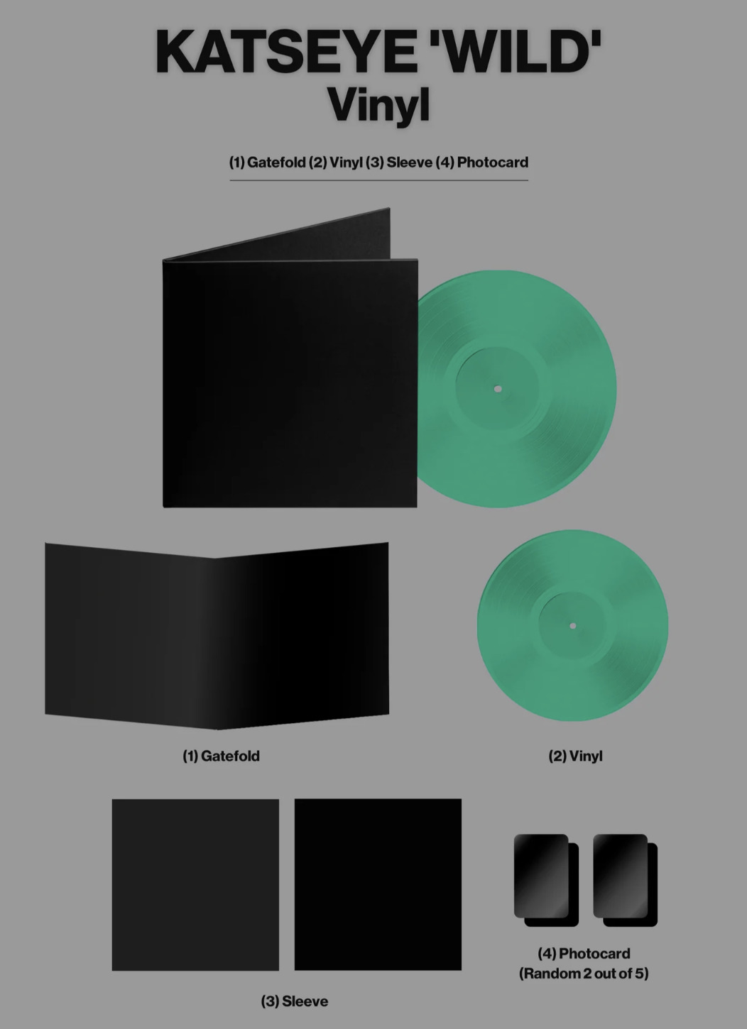 2 Photocards (random 2 out of 5: double-sided with 4 images - 2 Wild world vinyl version images on one side & 2 Wild heart vinyl version images on the other side; One card per member)